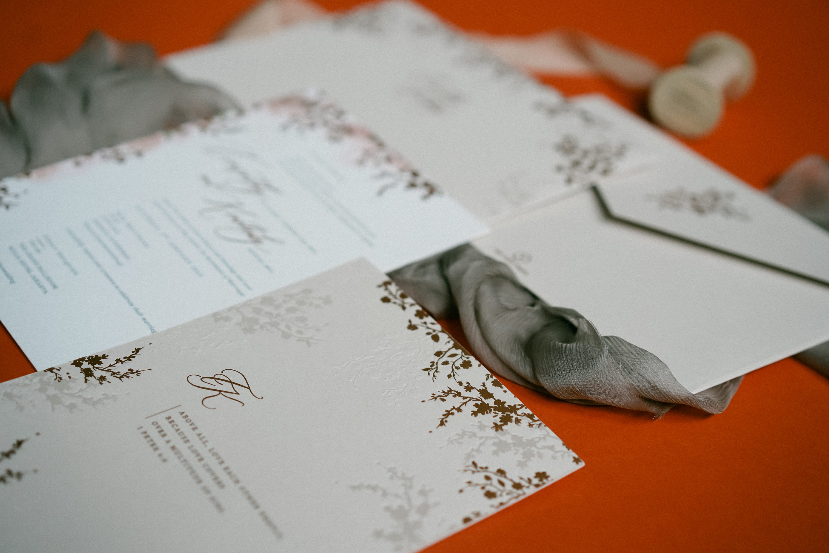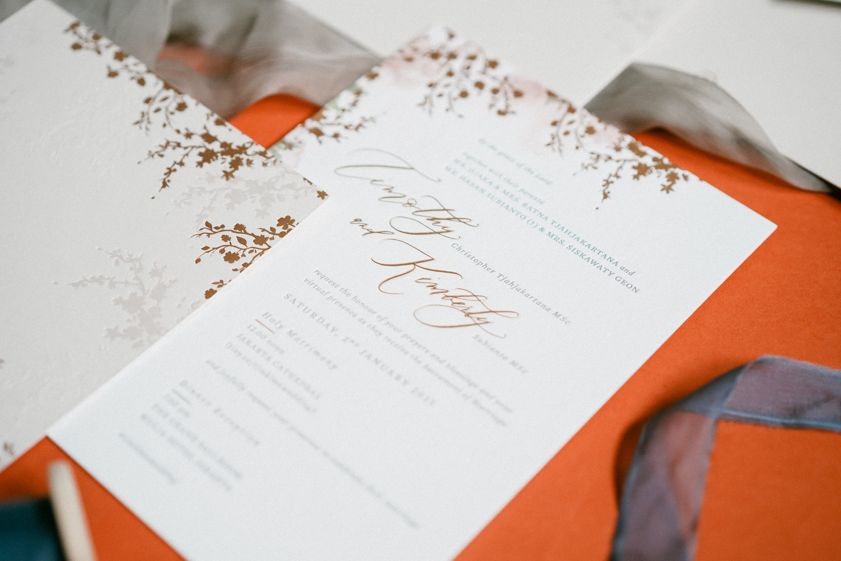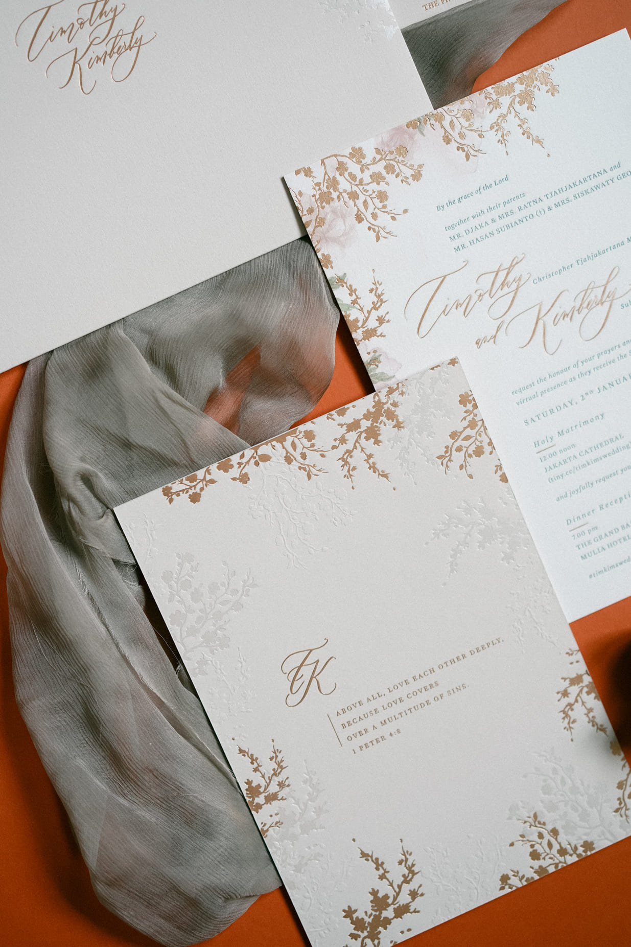 Mulia Hotel - Jakarta, Indonesia - Modern calligraphy - Gold & Pearl Foil fusion - Colorplan mist envelope - Letterpress invitation
